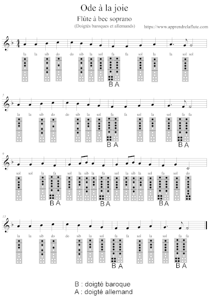 - Ode à la joie, flûte à bec soprano, FA majeur (avec les doigtés)